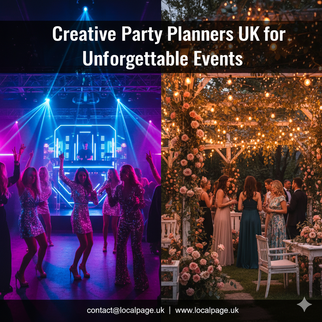 Creative party planners UK are the lifeblood of the social sector, bringing an element of surprise and delight to every gathering. These experts are masters of theme, decor, and atmosphere, ensuring that private celebrations—from Bar Mitzvahs to golden anniversaries—are handled with professional care. On Local Page UK, we provide a dedicated stage for these creatives to showcase their niche services. Whether you are an expert in immersive "secret" parties or high-end garden celebrations, our directory connects you with hosts who value original thinking.